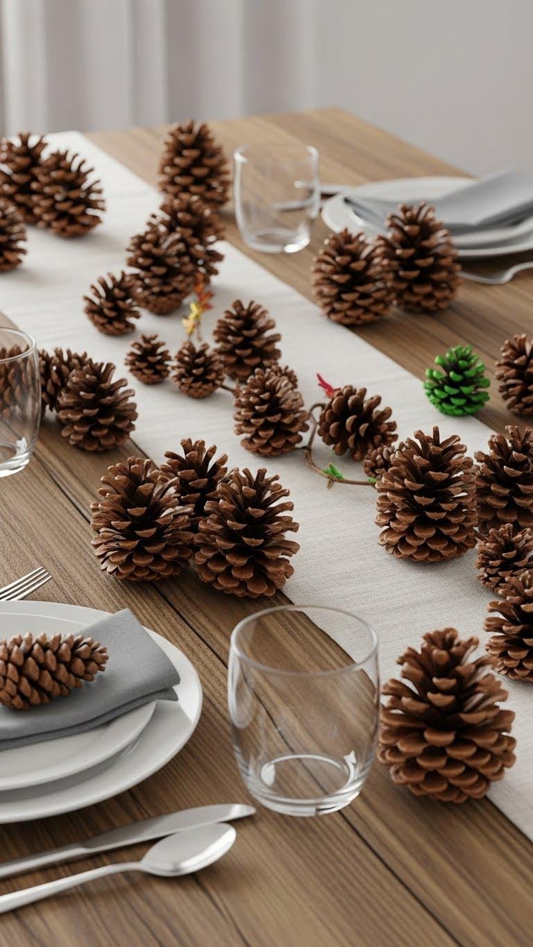 Try subtle pinecone painting for pops of color or string simple cone garlands along the runner for playful, liberated style.
